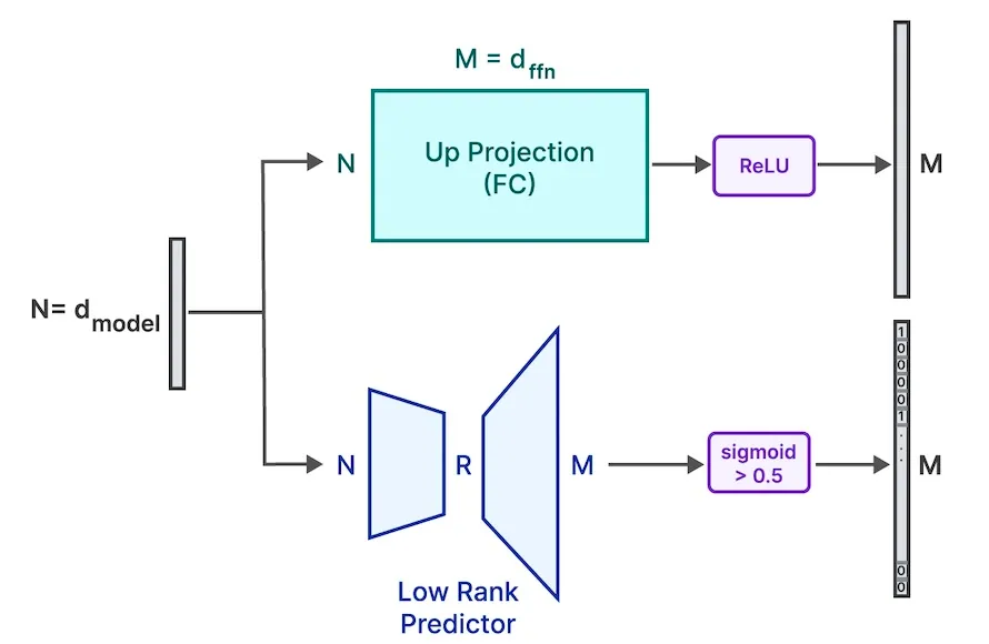 이를 달성하기 위해 FFN의 어느 부분이 비희소할지를 결정하고 로드해야 하는 데이터 양을 줄이는 “Low Rank Predictor” 네트워크를 사용한다. 그런 다음, 이 예측기가 식별한 활성 뉴런을 메모리로 전송한다.