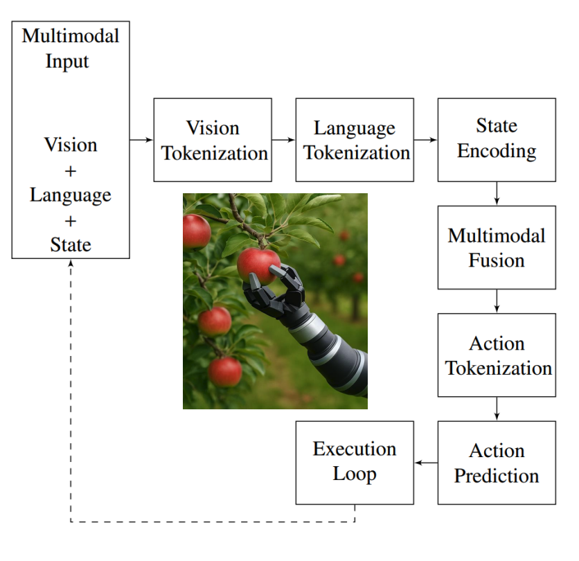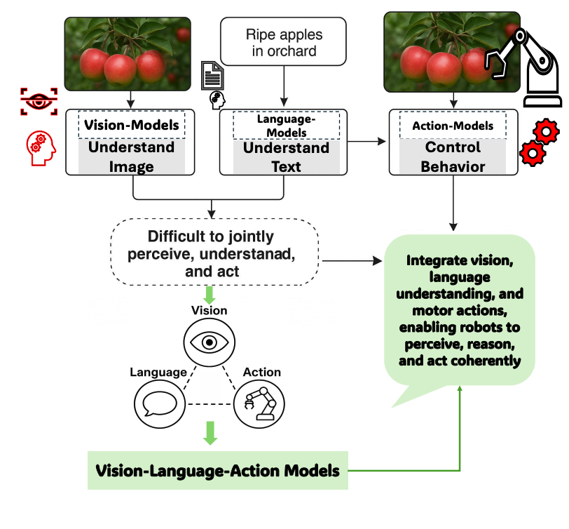 이와 대조적으로, 최신 VLA 모델은 대규모 사전 훈련된 인코더와 트랜스포머 기반 아키텍처를 활용하여 여러 데이터 양식(modality)을 end-to-end로 융합합니다. 예를 들어, “잘 익은 빨간 사과를 집어라”(Figure 5)라는 명령이 주어지면, 비전 인코더는 장면 속 객체와 그 속성을 파악하고 언어 모델은 명령어의 의미를 벡터로 변환합니다. 이후 두 정보는 cross-attention과 같은 기술을 통해 하나의 통합된 잠재 공간으로 결합되어, 상황에 맞는 유연한 행동 정책(Action Policy)을 생성하는 기반이 됩니다.