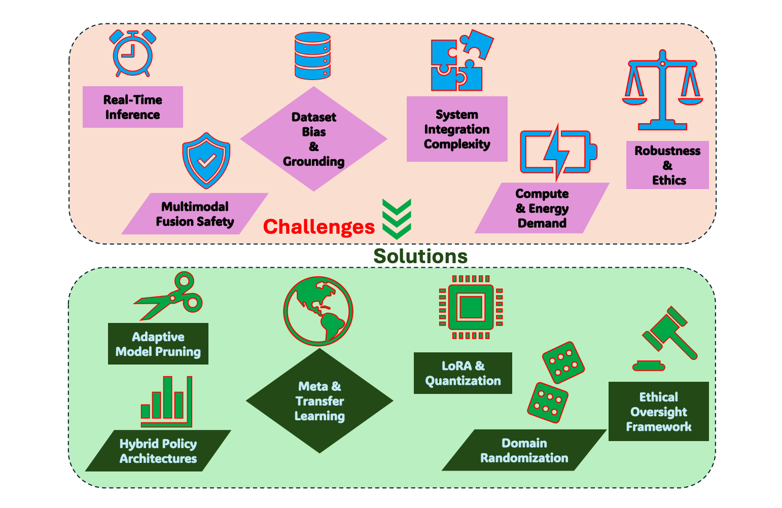 VLA 모델은 실제 환경에 적용되기 위해 알고리즘, 컴퓨팅, 윤리 차원에서 다음과 같은 다면적 과제에 직면해 있습니다.