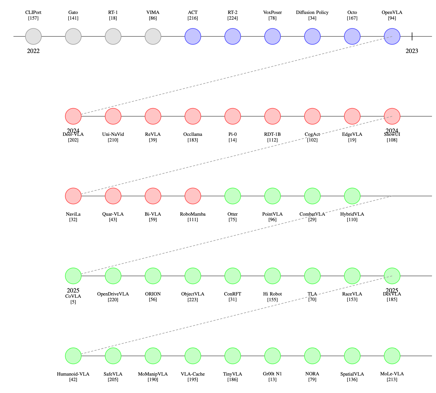 VLA 모델의 발전 과정은 2022년부터 2025년까지 크게 세 가지 뚜렷한 단계로 구분할 수 있습니다.