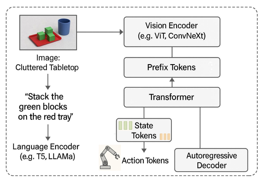 - 액션 토큰 생성: 융합된 표현을 autoregressive decoder(일반적으로 Transformer)에 입력하여, 일련의 액션 토큰을 순차적으로 예측