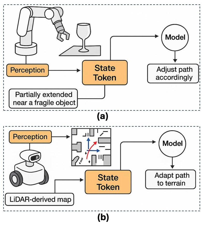 - 조작 시: 로봇 팔이 물체에 충돌할 위험이 있을 때, 상태 토큰이 현재 관절 각도, 그리퍼 위치 등의 정보를 제공. 모델은 이를 바탕으로 충돌을 예측하고 궤도를 수정하거나 힘을 조절함.