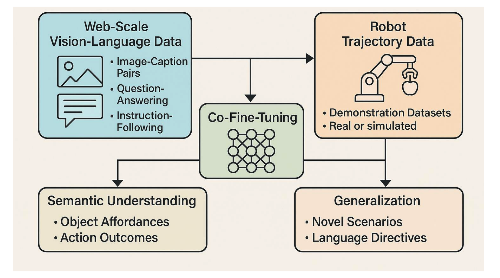 VLA 모델을 훈련시키기 위해서는 웹에서 얻은 방대한 의미론적 지식과 로봇 데이터셋의 실제 작업 정보를 결합하는 하이브리드 학습 패러다임이 필수적입니다. 이 과정은 일반적으로 두 단계로 진행됩니다. 첫 번째 사전 훈련 단계에서는 이미지-캡션 쌍과 같은 대규모 인터넷 데이터를 사용하여 모델에 세상에 대한 범용적인 이해와 상식 추론 능력을 주입합니다. 이 단계는 모델이 객체, 행동, 개념에 대한 기본적인 표현을 학습하고 시각과 언어 정보를 하나의 공유된 공간에서 정렬하도록 만들어, 이후 새로운 작업을 수행할 수 있는 기반을 마련합니다.